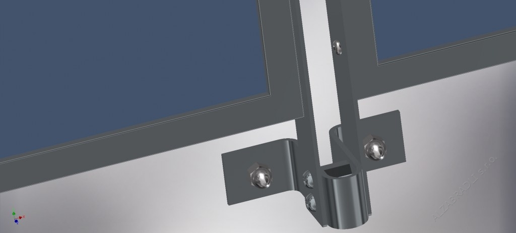 Popis: Tento model zábradlie je možné použiť do vonkajších i vnútorných plôch. Výplne sú z bezpečnostného lepeného skla 3.1.3, ktoré sa vyrába podľa potreby a daného miesta. Stojky zábradlia sú z plochej tyčoviny 50x4mm a všetko je ukotvené na závitové pozinkované tyče M12, ktoré sú do steny uložené v extréme pevnostnej chemickej malte FISCHER VL410. Všetky diely zábradlia sú opatrené povrchovou úpravou žiarovým zinkovaním a to až po vyvŕtaní všetkých otvorov. Nehrozí preto korózia v mieste spojenia a celé zábradlie je chránené do posledného milimetra.