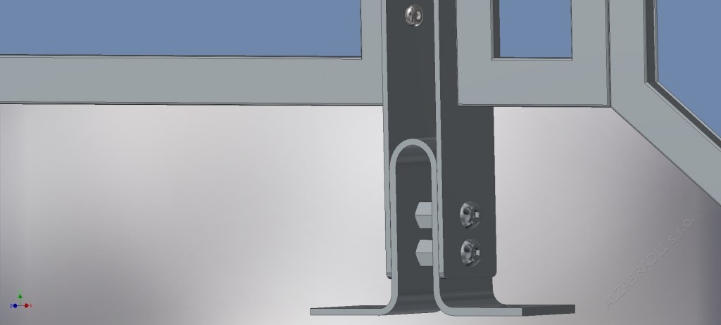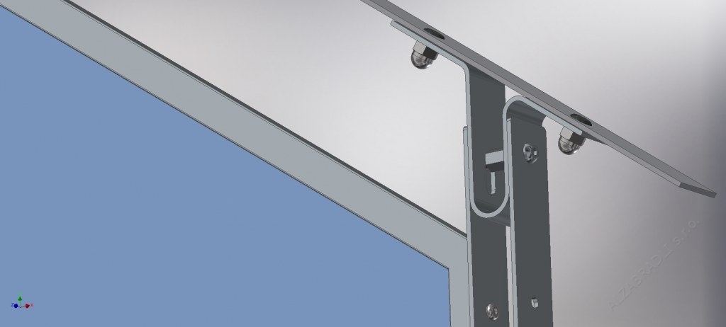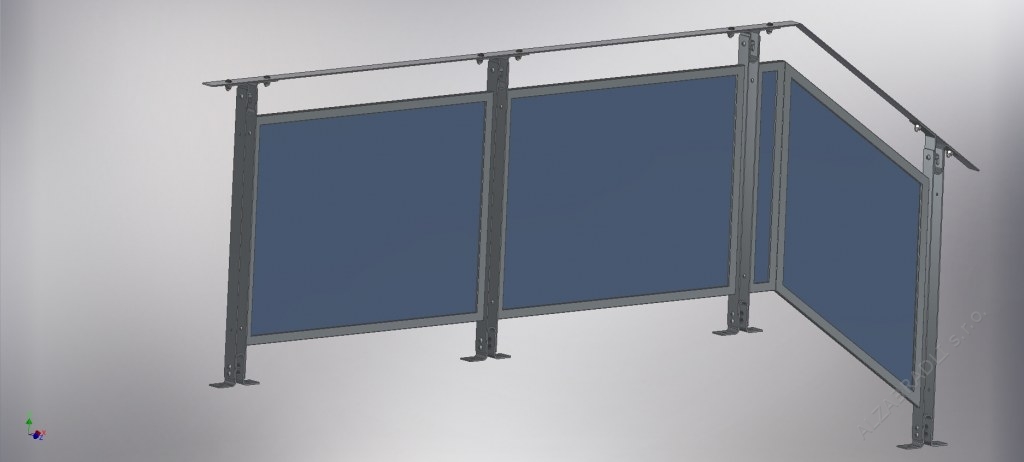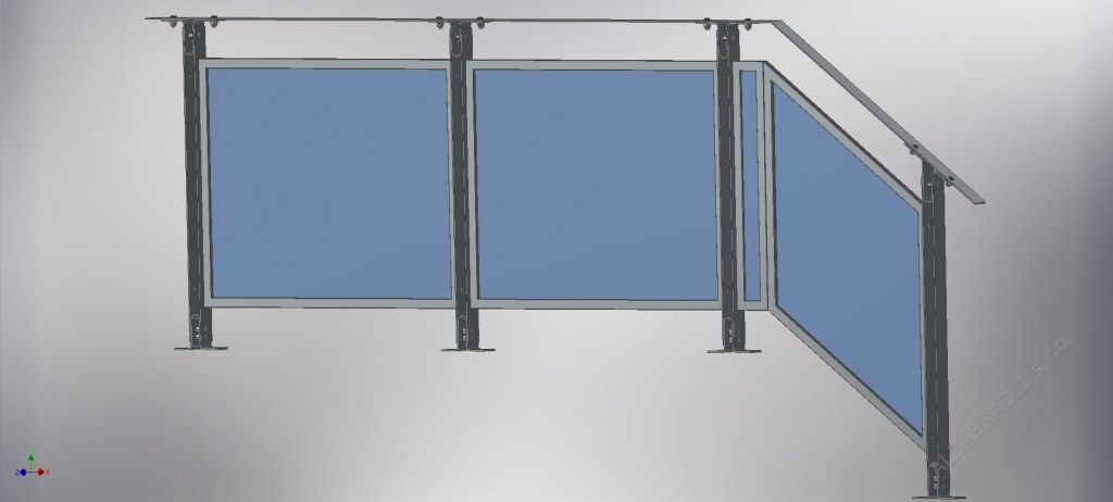 Popis: Tento model zábradlie je možné použiť do vonkajších i vnútorných plôch na schodisko a šikminy. Výplne sú z bezpečnostného lepeného skla 3.1.3, ktoré sa vyrába podľa potreby a daného miesta. Stojky zábradlia sú z plochej tyčoviny 50x4mm a všetko je ukotvené na závitové pozinkované tyče M12, ktoré sú do steny uložené v extréme pevnostnej chemickej malte FISCHER VL410. Všetky diely zábradlia sú opatrené povrchovou úpravou žiarovým zinkovaním a to až po vyvŕtaní všetkých otvorov. Nehrozí preto korózia v mieste spojenia a celé zábradlie je chránené do posledného milimetra.